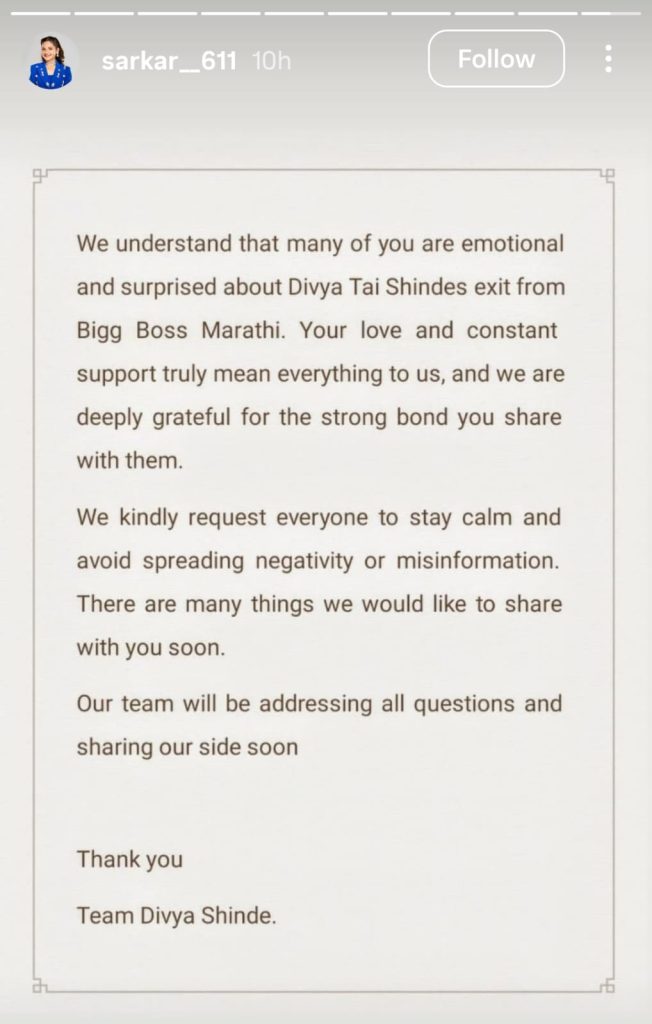 दरम्यान, दिव्या शिंदे(DIVYA SHINDE)हिच्या टीमकडून सोशल मीडियावर शेअर करण्यात आलेली पोस्ट सध्या व्हायरल होत आहे. त्या पोस्टमध्ये “खूप काही सांगायचं आहे” असा उल्लेख करण्यात आला असून, यामुळे दिव्या पुढे काय भूमिका मांडणार याबाबत उत्सुकता वाढली आहे. सध्या ही पोस्ट आणि दिव्याची हकालपट्टी यावर सर्वत्र चर्चा सुरू आहे .